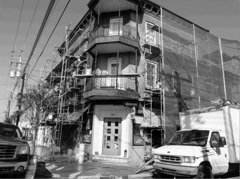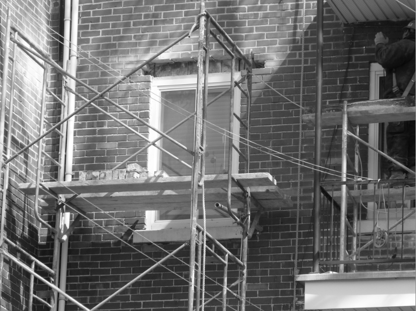 - En effet, la région de Montréal est soumise à d'importants cycles gel-dégel (fluctuations de la température au-dessus et au-dessous du point de congélation). Conjuguée au mouillage, l'action gel-dégel cause l'effritement de la maçonnerie. En règle générale, les cheminées, les parapets, les murs autoporteurs, les appuis de fenêtres, les escaliers extérieurs situés au niveau ou en dessous du sous-sol sont les éléments architecturaux les plus exposés à une dégradation importante.